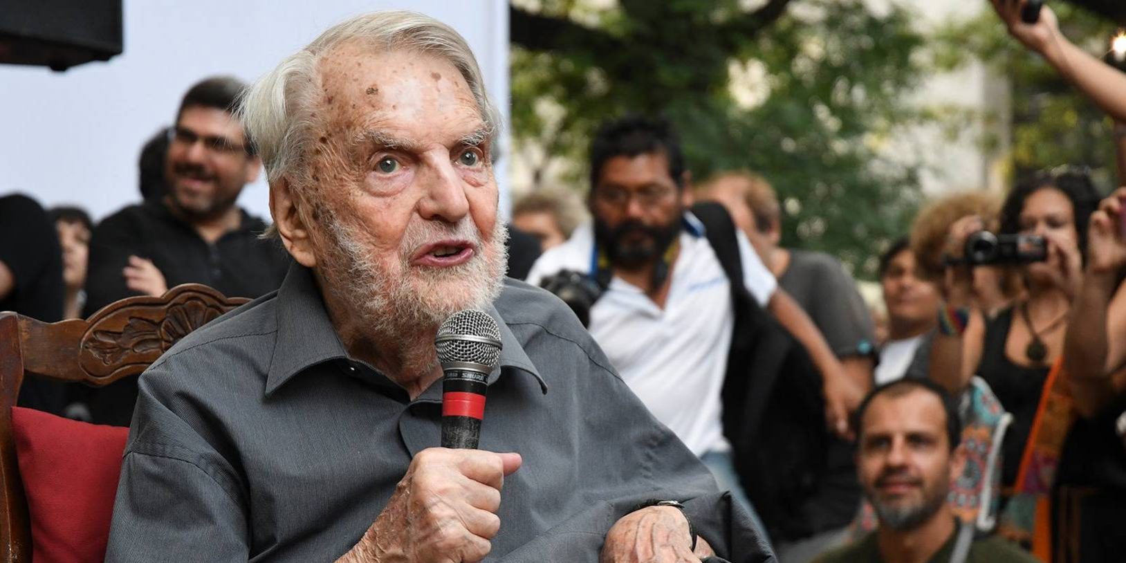 “Tan solo 15 días después de que fuera declarado Ciudadano Ilustre de Buenos Aires por la administración de Aníbal Ibarra,25 fue declarado Persona non grata por el Senado de la Nación Argentina, bajo una iniciativa de Eduardo Menem, “por haber presentado un proyecto, como ciudadano, de unir las dos Patagonias, la argentina y la chilena, como primer paso para el Mercado Común Latinoamericano”.26 En esto, el Senado se retractó en el año 2008.27 Finalmente, por iniciativa del senador Daniel Filmus, el Senado declaró su reconocimiento como luchador por los derechos humanos.28 En 2008, recibió también el Gran Premio de Honor de la SADE.