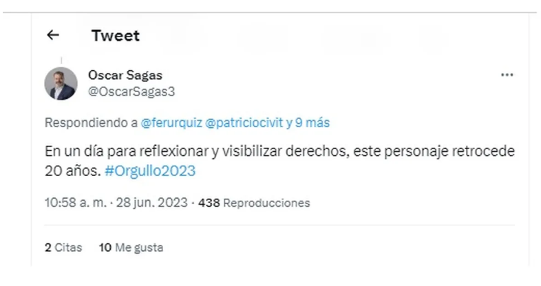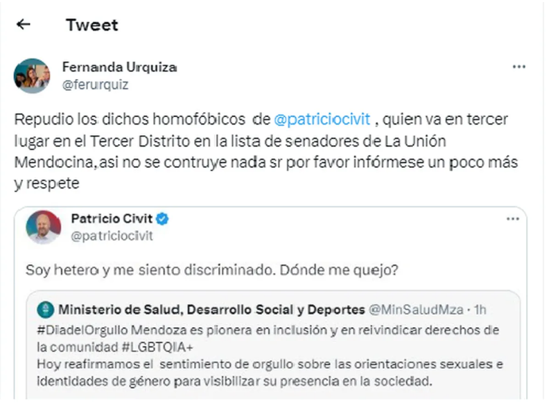 “Civit se valió de un tuit que se publicó en la cuenta oficial del Gobierno de Mendoza, y que hacía alusión al Día Internacional del Orgullo LGBTQIA+, para asegurar -a través de la misma red social- que él se siente “discriminado” por ser heterosexual.