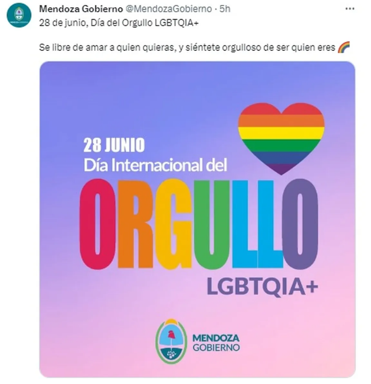 “El tuit al que reaccionó Civit y que fue publicado en la cuenta oficial del gobierno de Suarez, tiene que ver con un mensaje positivo acerca de la fecha en la que la comunidad LGBTQIA+ recuerda la lucha por sus derechos.