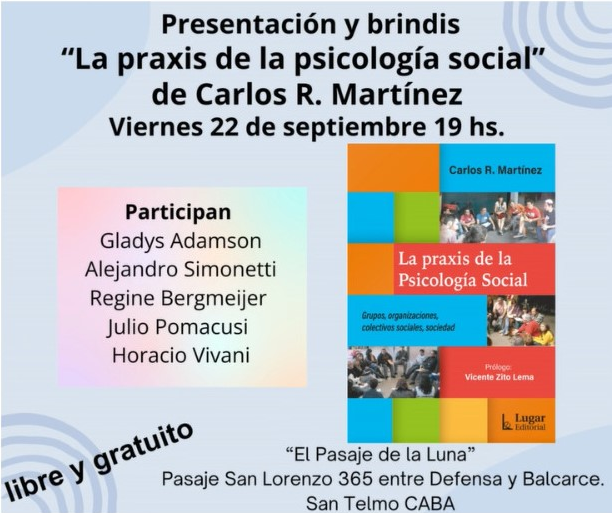 “Se presenta en las librerías del país “La praxis de la psicología social. Grupos, organizaciones, colectivos sociales, sociedad”, de Carlos Martínez. Un trabajo cuyo objetivo es actualizar muchas de los temas de nuestro campo de estudio, con el respaldo de décadas de trabajo científico y militante en el mundo del trabajo y ofreciendo nuevas metodologías de abordajes de las problemáticas psicosociales. El prólogo escrito por Vicente Zito Lema lo describe como “un libro destinado a provocar un verdadero acontecimiento en el fértil campo de la psicología social. Cabeza fría y corazón caliente, decía un gran pensador desde la cárcel. En ese camino va este libro que deja huella en el universo de la psicología social”.