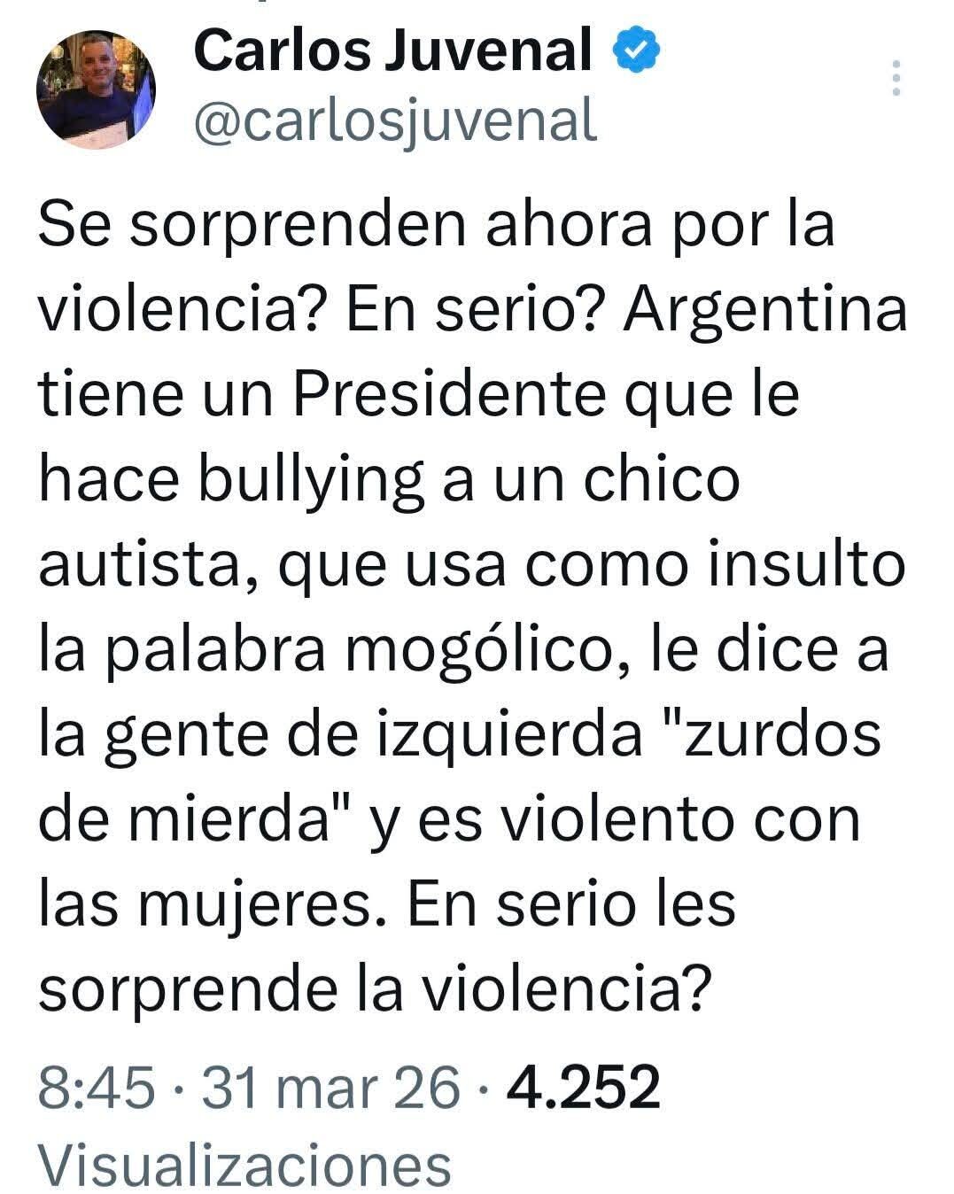 ““Postea las fotos con ellos como si fuera un orgullo tener un tipo que dice ‘vamos a matar gente’. ¿Está mal decir que va a haber una crisis de gobernabilidad o esta mal decir que vas a vender órganos?”, expresó en referencia a las polémicas declaraciones de Milei sobre el tema y sostuvo que, además, “lleva a una vicepresidenta que reivindica genocidas”.