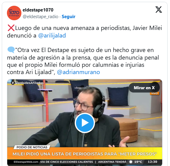 “A Lijalad -trabajador de El Destape- lo denunció por una nota titulada “Milei, entre el odio a la información y el discurso nazi”. Allí el periodista respondía a un posteo del presidente y, además, advertía sobre el peligro de la incitación al odio. “Otro paso en su cruzada por imponer sus opiniones como un hecho y por negar la existencia de información veraz, chequeada y producida de forma profesional”, posteó Lijalad acerca de la situación.