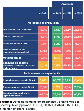 “La situación estaría lejos de mejorar en los próximos meses. Tras la contracción de la producción industrial en jul/25 (-2,3% mensual y -1,1% interanual), datos anticipados para agosto (la cifra oficial se conocerá recién el próximo 8 de octubre) indican que se prevé una baja en torno al 3% en términos interanuales y un estancamiento mensual. De esa manera, “el sector ya acumula una merma promedio del 10% en lo que va del año comparado contra 2022 y 2023”, advirtió el Centro de Estudios (CEU) de la Unión Industrial Argentina (UIA). Es decir que, más allá del bajo nivel de comparación del 2024, el sector se encuentra por debajo de, al menos, los últimos 4 años.