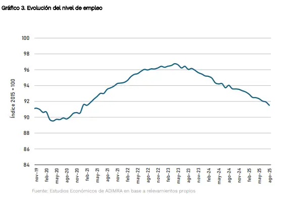 “Por último, desde Adimra reconocieron que las perspectivas para los próximos meses tampoco muestran señales alentadoras: el 74,4% de las empresas prevé que su nivel de producción se mantendrá sin cambios o disminuirá. Por otro lado, hay un creciente número de empresas que anticipan posibles ajustes en su dotación de personal: el 90,5% de las firmas no esperan modificaciones en su plantilla o esperan disminuirla.