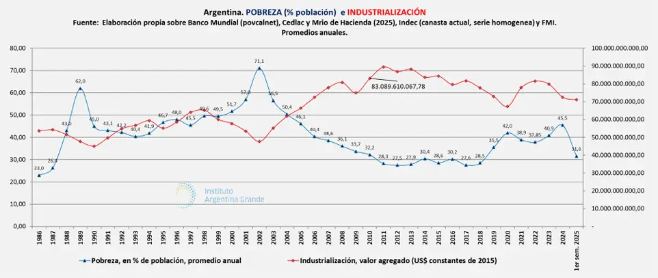 “El derrotero de las principales actividades industriales las ubica en el peor nivel de, al menos, los últimos 4 años. En lo que va del 2025 se confirmó la tendencia contractiva de un sector que ya acumula un retroceso promedio del 10% frente al 2023 y al 2022. Las consecuencias no son menores: la pérdida de fuentes laborales industriales se vincula directamente con un empeoramiento de las condiciones de vida de la población al punto de que el único momento en el que coincidió una baja de la pobreza con una caída de la industria fue en la salida de la hiperinflación.