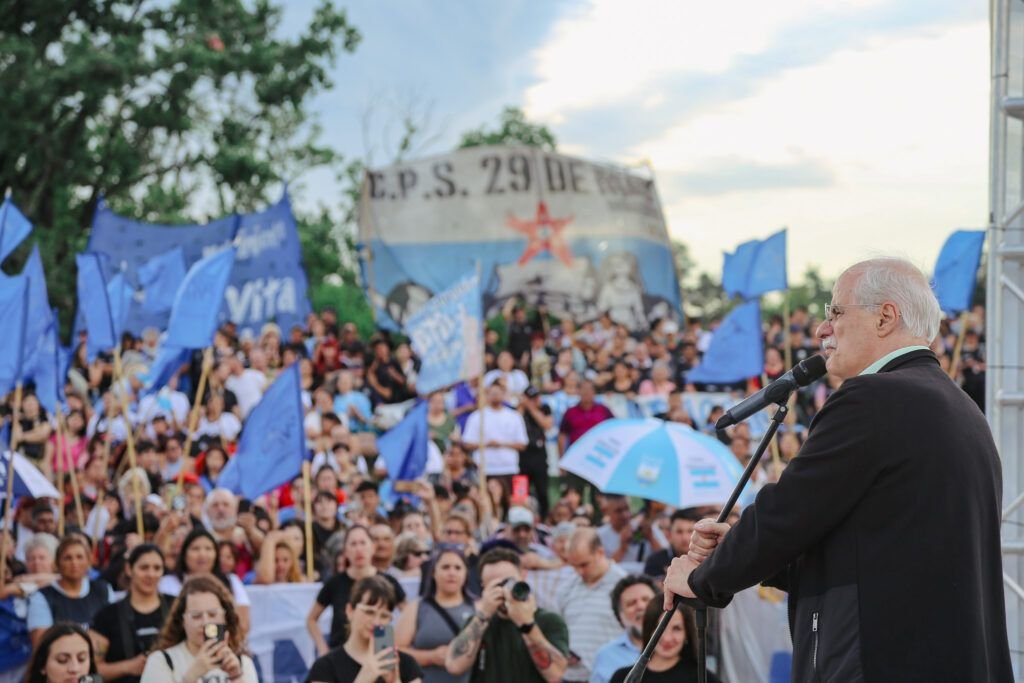 “Arriba del escenario, Jorge Taiana se detiene en la faceta musical del presidente Javier Milei y su “Banda presidencial”. “¡No saben ni cantar!”, grita otra vez alguien entre los asistentes. “Es bastante peor manejando los recursos de la sociedad argentina. Esta banda presidencial está dispuesta a destruir todo lo bueno que hay en Argentina”.