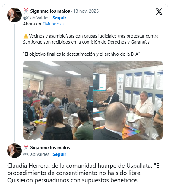 “Entre los presentes, Claudia Herrera resumió la oposición del pueblo huarpe de Uspallata. Las comunidades Huarpes Guaytamari y Llahue Xumec hicieron público días atrás el resultado del procedimiento de Consentimiento Libre, Previo e Informado (CLPI): una negativa rotunda al proyecto PSJ Cobre Mendocino.