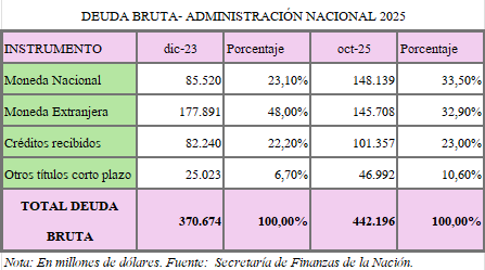 Al 31 de octubre de 2025, el total de la deuda bruta de la Administración nacional era de 442.196 millones de dólares. Dentro de ella, la cifra en pesos (son títulos en pesos que, para contabilizarlos, la Secretaría de Finanzas convierte en dólares) asciende a 148.139 millones de esta última divisa. Además, dentro de esa deuda en pesos están capitalizados intereses desde enero 2024 a octubre 2025 (22 meses) en un BONCAP (Bono de Capitalización) por 41.757 millones de dólares.