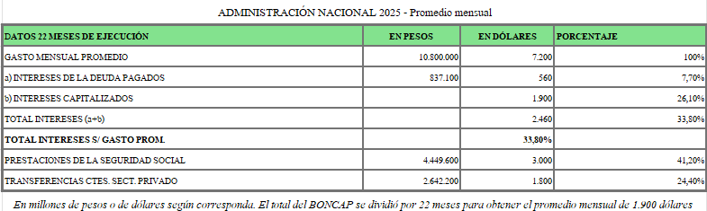 En promedio mensual, el total del gasto de la Administración nacional es de 10,8 billones de pesos; convertido a dólar a 1.500 pesos, serían 7.200 millones de dólares por mes. Eso es lo que gasta el gobierno nacional en personal, en bienes, en servicios, en subsidio, en salud, en educación, en asistencia social, en seguridad, en las fuerzas armadas, en las pocas obras públicas que hace y/o financia, etc.