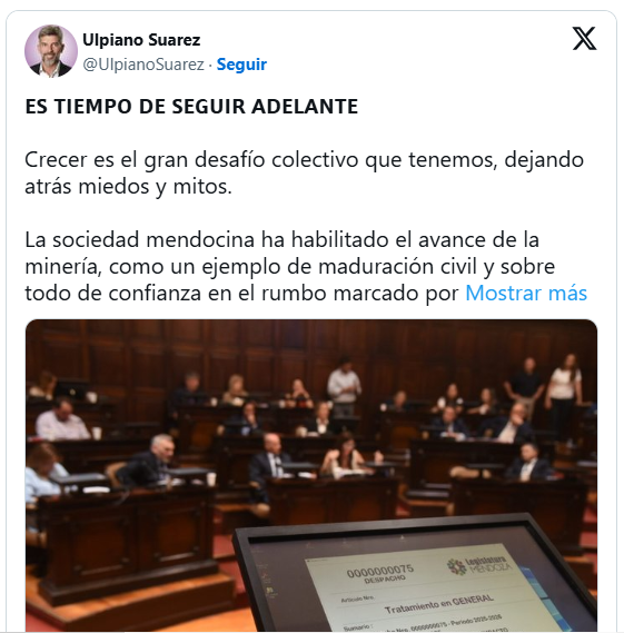 “Tras la reciente aprobación en la Legislatura de la provincia de Mendoza de PSJ Cobre Mendocino, el intendente de la Ciudad de Mendoza, Ulpiano Suarez, utilizó su cuenta personal en la red social X para brindar un fuerte respaldo a la decisión de los legisladores locales, calificándola como un acto de “maduración civil” de la sociedad mendocina.