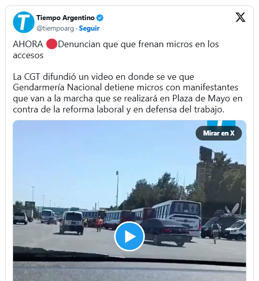 ““Estamos viendo cómo llegan los compañeros y evaluando el camino para llegar porque los frenan”, comentaron en la columna de Conadu, ubicada junto a las CTA sobre Diagonal Norte. Enseguida, un tuit de la CGT denunció la maniobra del gobierno. “Repudiamos enérgicamente el accionar de la Gendarmería Nacional, cuyos agentes están deteniendo micros en los accesos e impidiendo el traslado de miles de manifestantes hacia la movilización”, señalaron en la cuenta oficial de X.