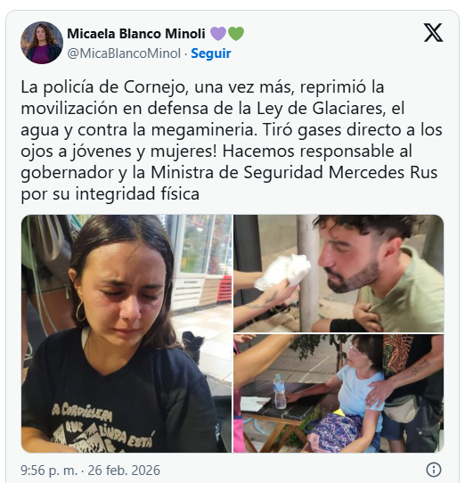 “Las calles de la capital mendocina volvieron a ser el epicentro de una marcha de vecinos, asambleístas y familias enteras este jueves en rechazo a las modificaciones de la Ley 26.639 (Ley de Glaciares) que impulsa Javier Milei para hjabilitar a las mineras a extraer metales en zonas antes protegidas. Sin embargo, la jornada, que transcurrió mayormente en calma, se vio empañada al cierre por provocaciones de la Policía de Mendoza en medio de un operativo de seguridad desmedido que culminó con gases lacrimógenos y golpes contra manifestantes.