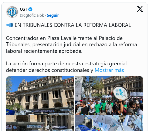 ““La acción forma parte de nuestra estrategia gremial: defender derechos constitucionales y señalar que la legislación impulsada por el Gobierno nacional es regresiva para las y los trabajadores”, explicó la CGT en sus redes sociales.