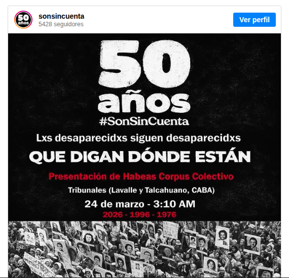 “El 24 de marzo a las 3.10 de la madrugada, exactamente medio siglo después del Golpe de Estado que instauró la última dictadura cívico-militar, se presentará un hábeas corpus colectivo “en reclamo de la información completa sobre lo sucedido con nuestros familiares, ya que, 50 años después, no sabemos dónde están y qué sucedió con ellxs”.