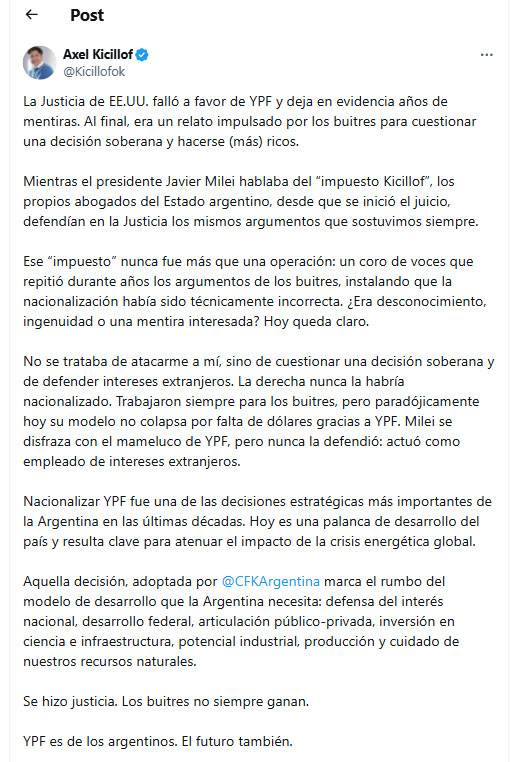 “También Macrì y Fernández reclamaron plácemes por su desempeño durante el largo proceso judicial y se los restaron a Milei. La verdad es que cada uno a su manera, cada cual hizo su aporte para llegar a este resultado, en un terreno judicial que es tan o más hostil que Comodoro Py. Pero el mérito de esos gobiernos ha sido el de sus equipos legales. Como bien dijo el actual ministro Luis Caputo, abogados que ganan mil dólares por mes vencieron a los estudios más poderosos del mundo, si bien CFK recordó, y encomió, el rol del estudio neoyorkino Sullivan & Crownwell. Pero antes de obtener la presidencia, Macrì dijo que había que cumplir el fallo del juez Griesa en favor de Paul Singer y sus buitres, y Milei dos años antes de ser electo Presidente maldijo “la confiscación ilegal de YPF”. La iniciativa de la expropiación la tomó Cristina. Néstor Kirchner estudió esa posibilidad pero concluyó que por entonces el país carecía de los recursos suficientes para hacerlo y se contentó con cancelar la deuda con el FMI como primer paso. Desde el Ministerio de Economía, Amado Boudou advirtió sobre la vertical disminución de las reservas apurada por Repsol y la reversión del balance energético que pasó a ser negativo por primera vez desde la privatización, y Kicillof ejecutó la expropiación luego de que Barack Obama le informara a Cristina que los estudios satelitales realizados por su país indicaban que en Vaca Muerta estaba una de las dos o tres mayores reservas de petróleo y de gas no convencional del mundo. Desde entonces el kirchnerismo supo que le tocaba la parte árida porque convertir ese tesoro en reservas explotables llevaría más años que los que le quedaban de gobierno, y que otro lo disfrutaría. Pese a lo cual la emprendió con el mayor esfuerzo. En cambio Milei, aún después del fallo, que festejó como un éxito propio, sentenció que “expropiar está mal porque robar está mal”. Este pobre hombre tiene un corso a contramano. Si se lo toma al pie de la letra festeja la impunidad de un robo, cuyo producto disfruta.