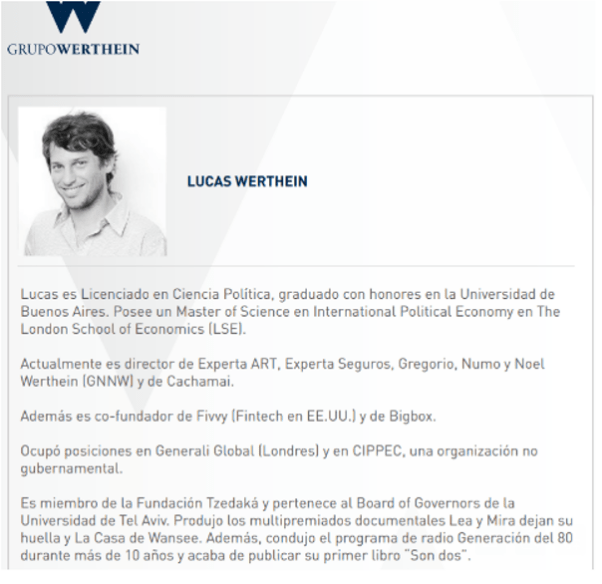 “El apoyo de la Zarina a Manuel Adorni tiene motivos políticos, pero también corporativos, que involucran al Grupo Werthein. Directivo de Torneos, Sociedad de Responsabilidad Limitada, inscripta en el estado de Florida, en Estados Unidos, Grandío es cuñado de Santiago Nofal, quien tiene como socio a Marcelo Rubén Wegbrait, socio a su vez de Lucas Werthein en la Sociedad anónima S.M.L. S.A..