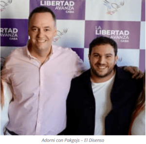 Foto: Diseño, Alejandro Ros. Animación, Silvia Canosa; “Marcelo Wegbrait y esposa/ Mara Gorini; “La Zarina, Adorni, Mara Gorini; “Scaturice con su amigo americano; “Adorni gira en otro programa de su amigo; “Milei y Adorni chez Grandío (Fotos El Disenso).