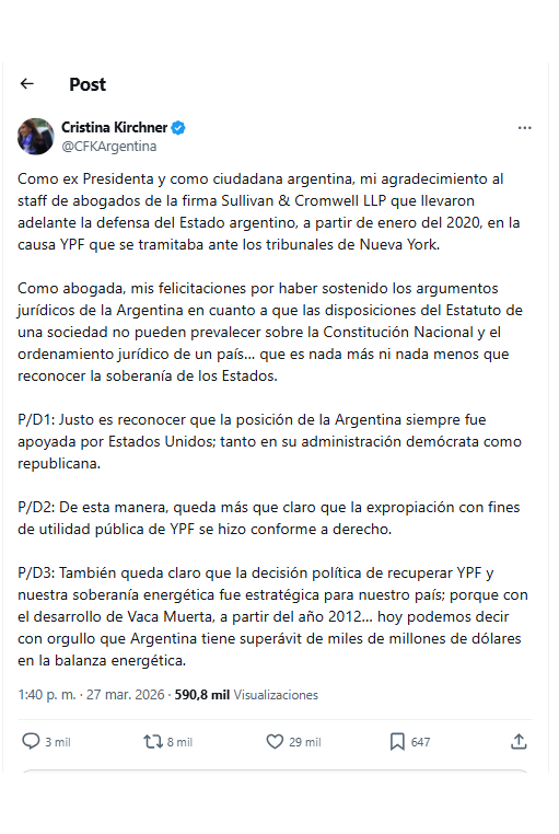 “En forma concisa, la ex Presidenta CFK explicó la importancia del fallo. Luego de felicitar al estudio de abogados de Nueva York que sostuvo los argumentos jurídicos de la Argentina: que el Estatuto de una sociedad no puede prevalecer sobre la Constitución Nacional y el ordenamiento jurídico de un país… “que es nada más ni nada menos que reconocer la soberanía de los Estados”. Recordó que siempre contó con el apoyo de Estados Unidos, tanto de los demócratas cuanto de los republicanos. Esa expropiación de YPF conforme a derecho fue una decisión política estratégica, ya que con el desarrollo de Vaca Muerta, a partir del año 2012,”la Argentina tiene superávit de miles de millones de dólares en la balanza energética”.