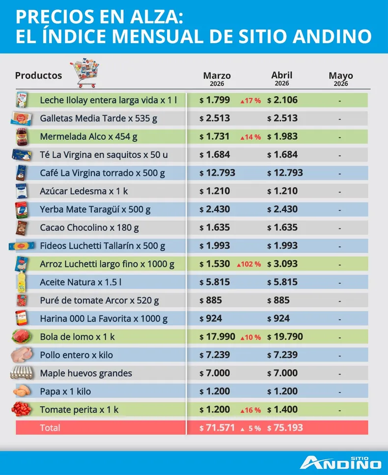 “El relevamiento mensual de Sitio Andino registró un aumento del 5,06% en alimentos en marzo. Hubo una disparidad contundente en la evolución de los precios. Los productos que se dispararon.
