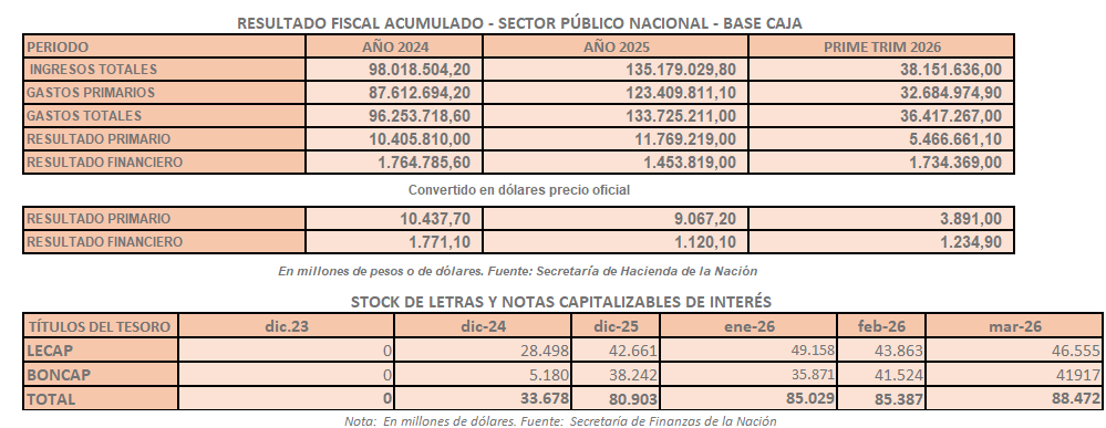 Y para el primer trimestre 2026, el superávit primario acumulado fue de un equivalente a 3.891 millones de dólares, pero se capitalizaron intereses por 7.569 millones de dólares que, de haberse pagado, significan un déficit fiscal de 3.678 millones de dólares.