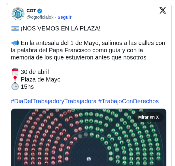 “En la previa del Día del Trabajador y la Trabajadora, la CGT realiza este jueves una marcha a Plaza de Mayo junto a organizaciones sociales, políticas y culturales con fuertes críticas a las políticas laborales, al ajuste permanente y a la pérdida de derechos durante el Gobierno de Javier Milei.